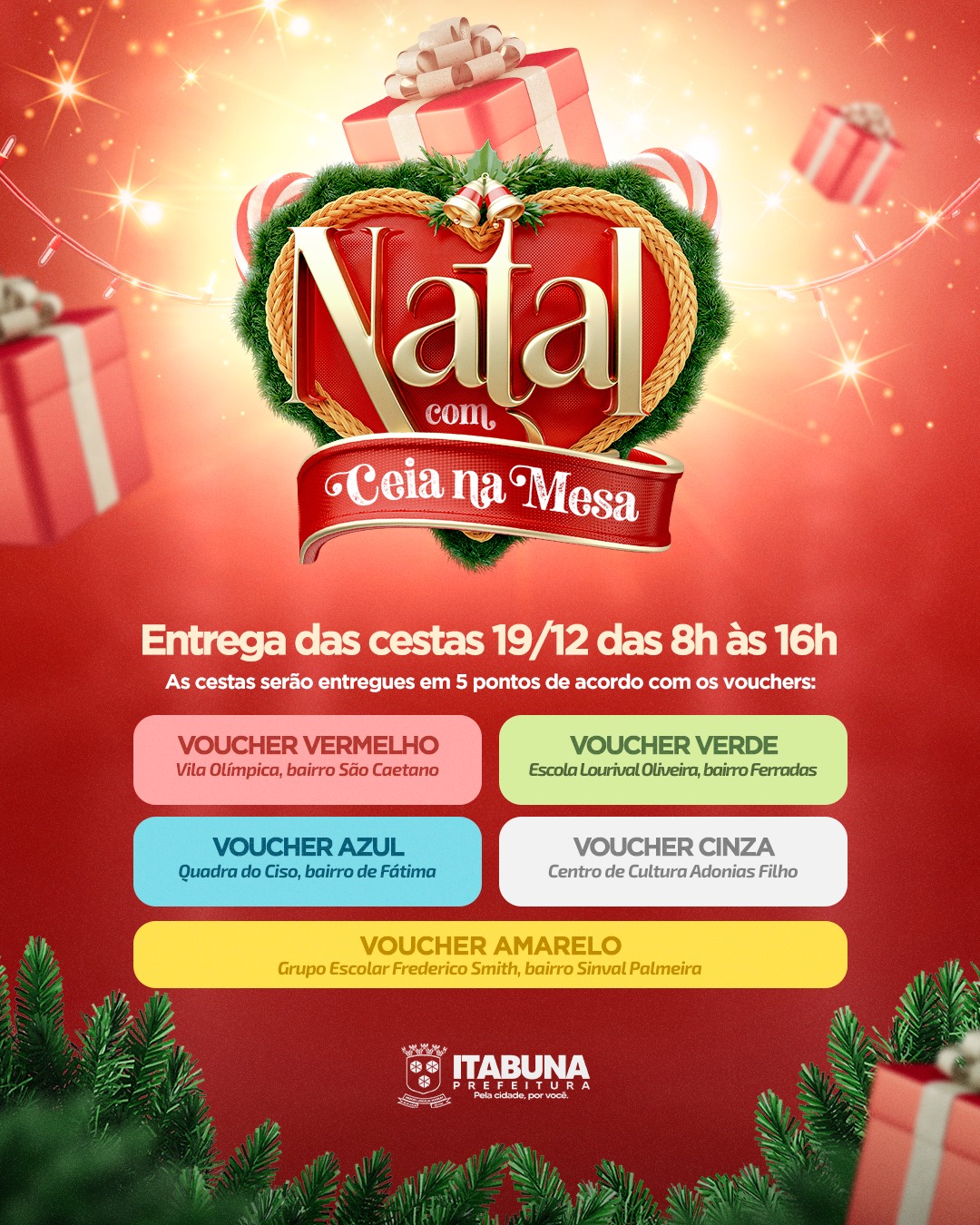 A Prefeitura de Itabuna, por meio da Secretaria de Promoção Social e Combate à Pobreza (SEMPS), divulgou a data de entrega das cestas natalinas do Programa Natal com Ceia na Mesa. A distribuição vai acontecer na quinta-feira, dia 19, das 9 às 16 horas.