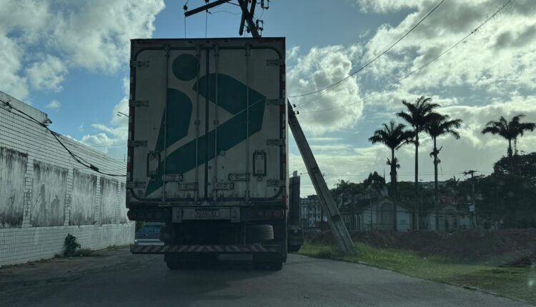 Caminhão baú derruba poste na Avenida Princesa Isabel, em Itabuna