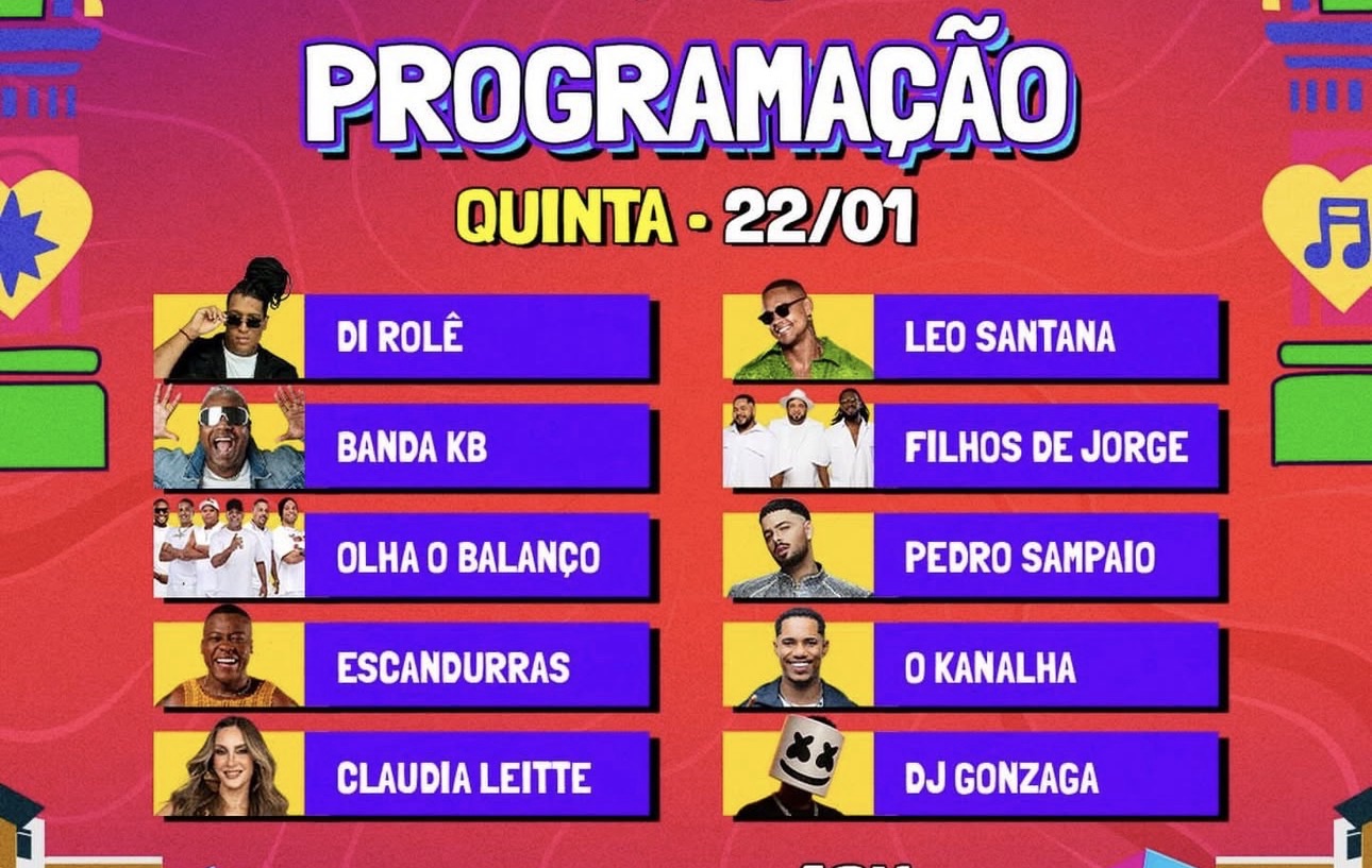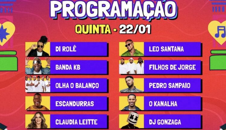 A programação desta quinta reúne atrações de diferentes estilos musicais, com nomes conhecidos do público baiano e nacional. Estão previstos shows de Di Rolê, Banda KB, Olha o Balanço, Escandurras e Claudia Leitte, além de Léo Santana, Filhos de Jorge, Pedro Sampaio, O Kanalha e DJ Gonzaga.