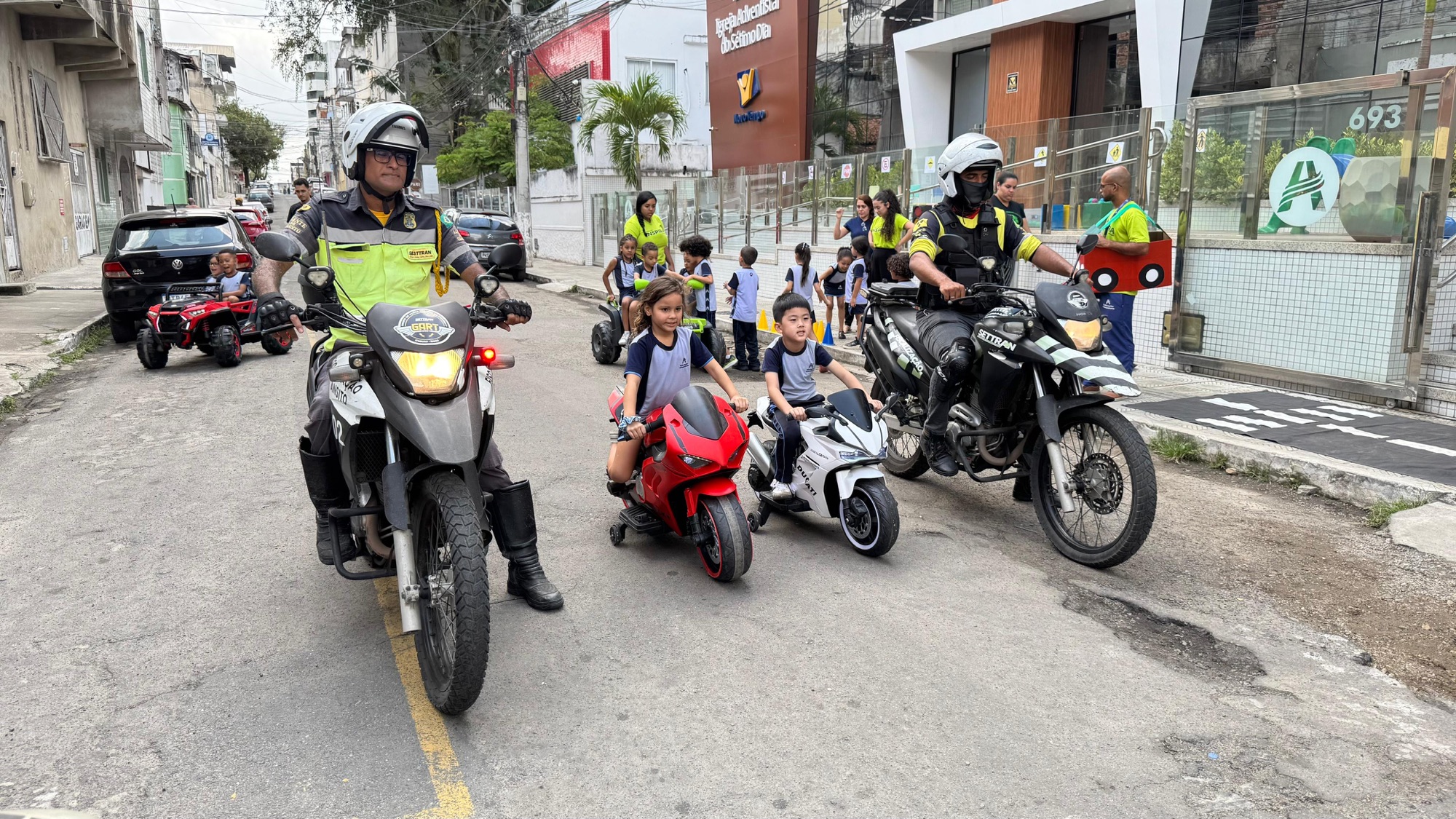 Na atividade, as crianças participaram de um circuito lúdico montado em frente à escola, onde vivenciaram situações do cotidiano no trânsito. Com mini veículos motorizados, os alunos reproduziram a rotina de motoristas e pedestres, acompanhados por agentes de trânsito da Settran, que orientaram sobre regras, sinalização e boas práticas de convivência nas ruas.