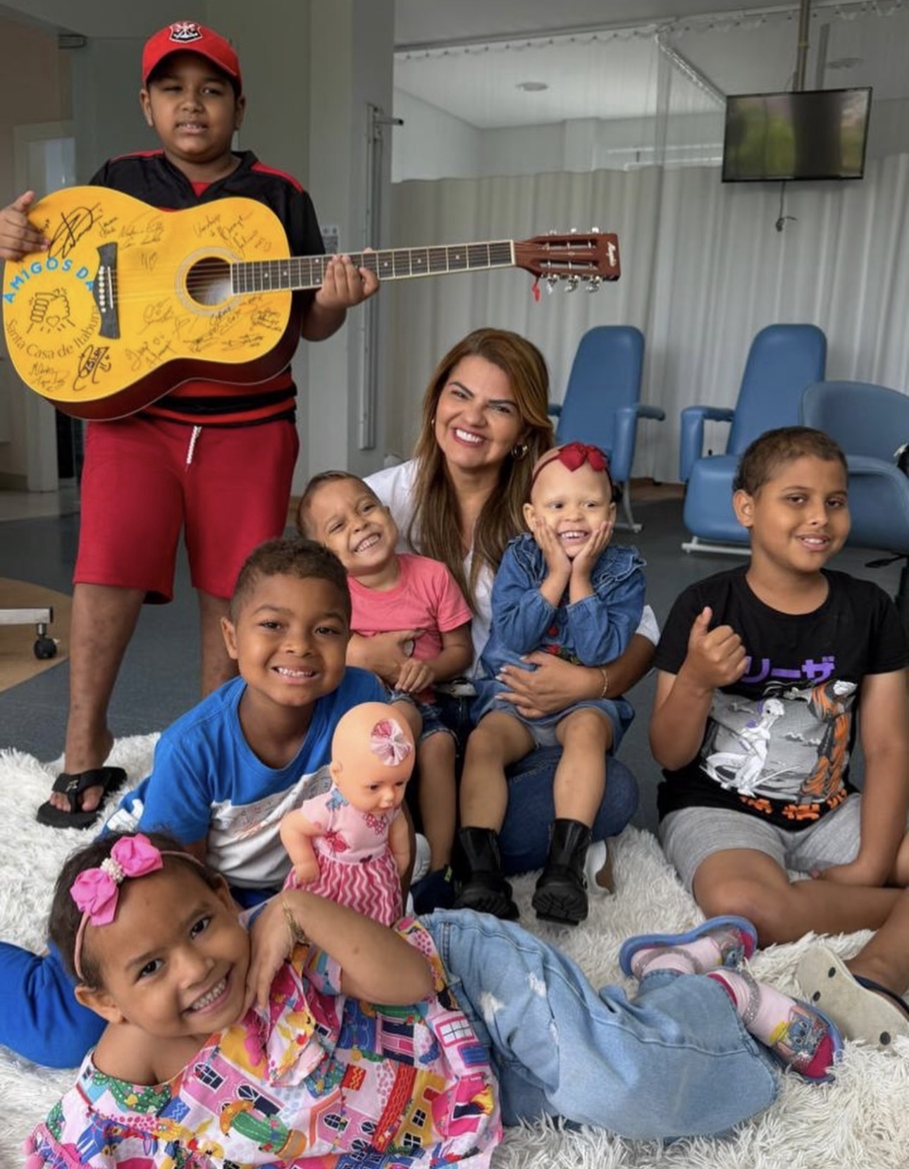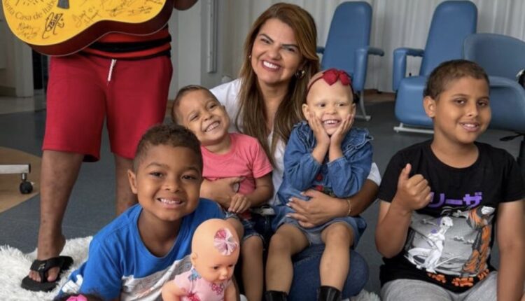 Andréa Castro, madrinha do setor de oncopediatria, participou da sessão de fotos, demonstrando afeto e atenção às crianças.