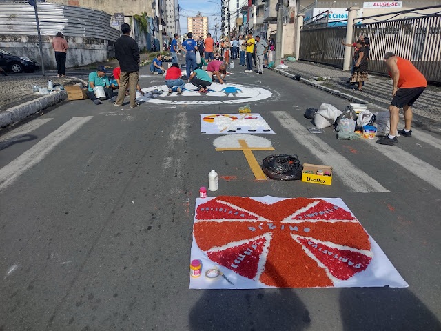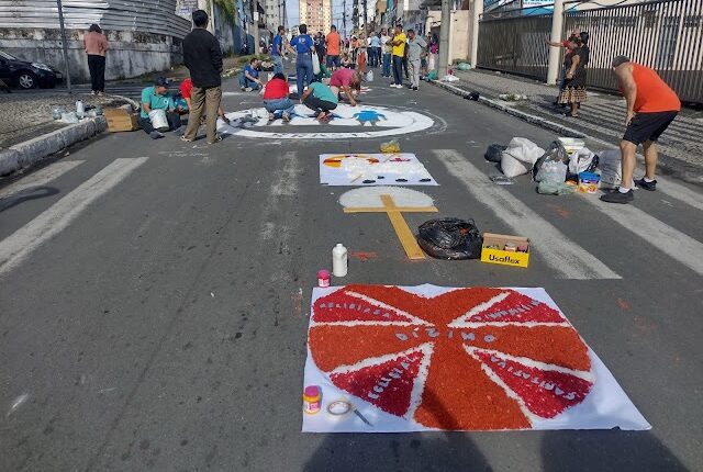 Em algumas cidades, moradores passam a madrugada toda trabalhando nos tapetes, transformando calçadas e avenidas em verdadeiros altares a céu aberto. O mais curioso? Os tapetes duram apenas algumas horas, sendo desfeitos à medida que a procissão avança, uma metáfora tocante sobre a passagem do tempo e a beleza do que é feito com fé.