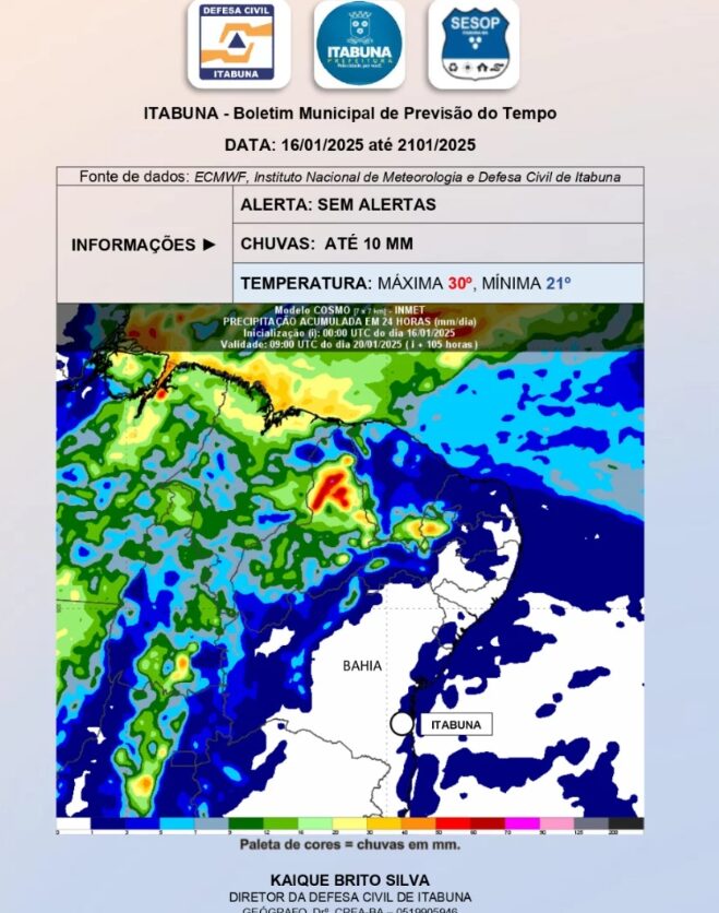 A Defesa Civil de Itabuna decretou o fim do Alerta Amarelo nesta quinta-feira(16), após sete dias de chuvas intensas que começaram na última sexta-feira. Durante esse período, a cidade registrou um acumulado de 118 milímetros de precipitação. O nível do Rio Cachoeira chegou a 2,3 metros acima da média, mas, felizmente, não houve ocorrências significativas.
