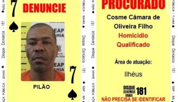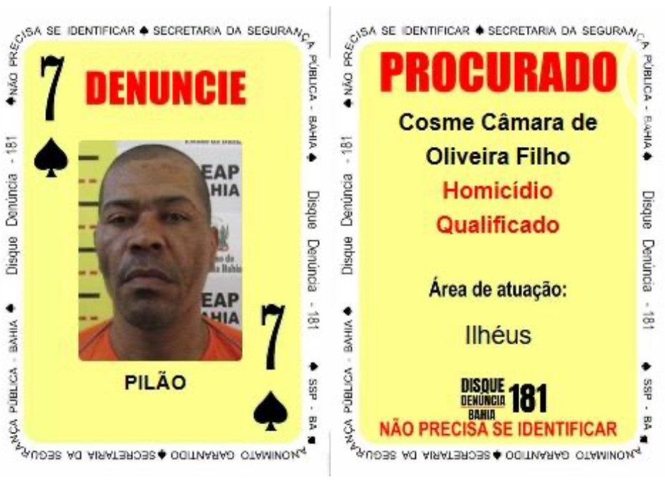 Assim como ‘Frango’, ‘Brasa’, o sete de espadas, atua na região de Camaçari. Ele tem mandado por homicídio, além de integrar uma organização criminosa que controla o tráfico de drogas local. O criminoso ‘Pilão’, fugitivo por homicídio qualificado, é o novo quatro do mesmo naipe dos outros procurados, mas com atuação na região sul do estado. As investigações policiais indicam que ele é um dos principais responsáveis por uma facção de Ilhéus.