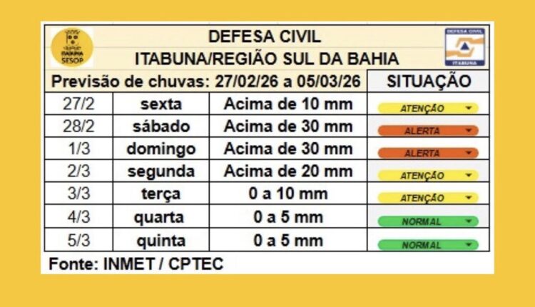 Itabuna e municípios da região entram em um período de instabilidade climática que exige cautela redobrada. A previsão indica volumes significativos de chuva entre esta quinta-feira (27) e o dia 5 de março, com maior intensidade concentrada no fim de semana.