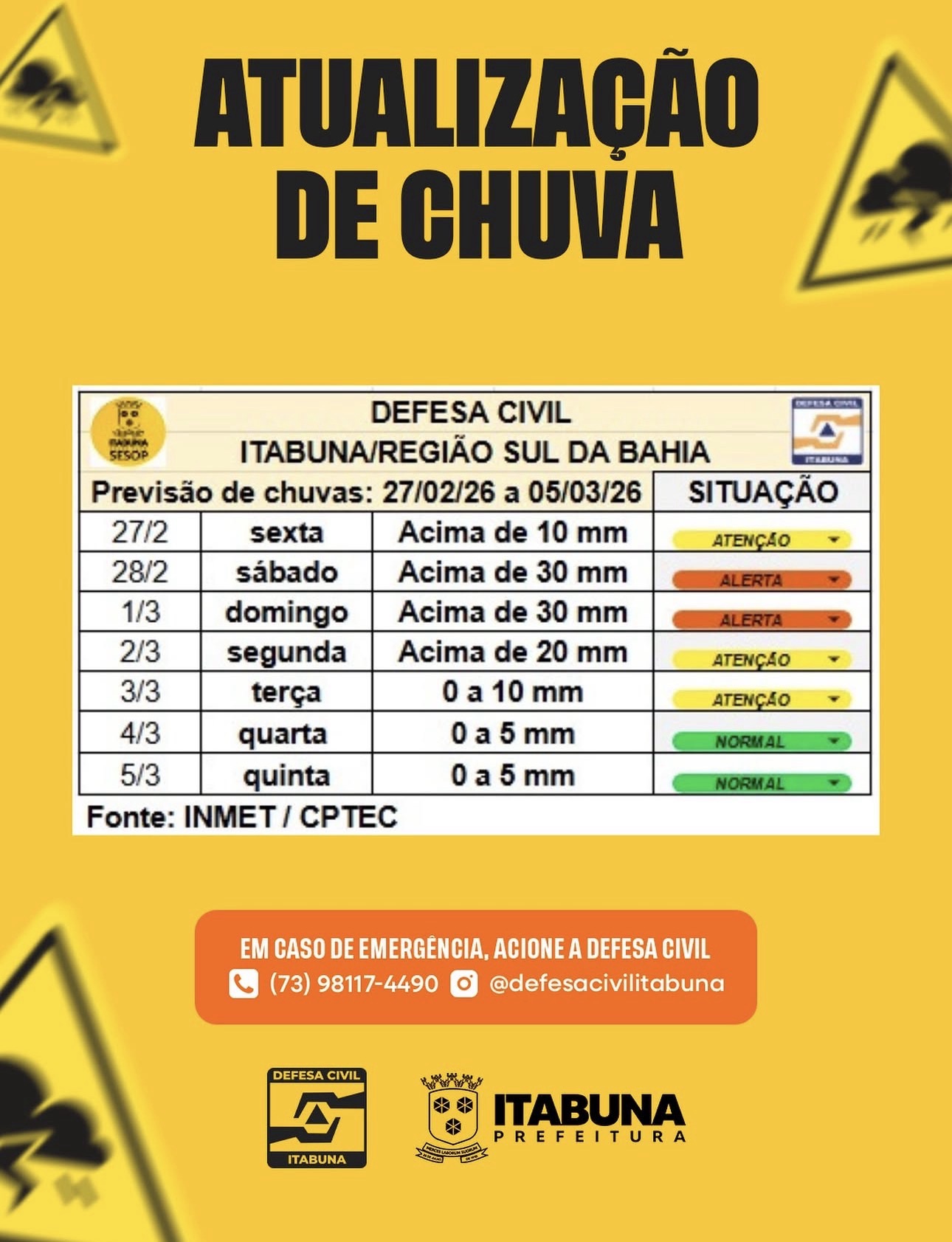Em caso de emergência, a Defesa Civil pode ser acionada pelo telefone (73) 98117-4490 ou pelo Instagram @defesacivilitabuna.