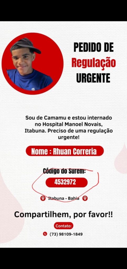 A vida do jovem Rhuan Correia dos Santos, natural de Camamu, está em risco. Internado desde o dia 21 de julho no Hospital Manoel Novaes, em Itabuna, o paciente aguarda, em estado delicado, uma transferência urgente para uma unidade hospitalar com suporte especializado em ortopedia e cirurgia vascular. O diagnóstico: artrite séptica em membro inferior esquerdo e trombose venosa profunda nas veias femoral e poplítea.