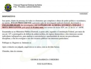 Uma decisão da 73ª Zona Eleitoral de Ubaitaba, proferida na sexta-feira (14),  a inelegibilidade por um período de 8 anos do ex-prefeito de Ubaitaba Asclepíades de Almeida Queiroz, conhecido como “Beda”, e de seu vice.