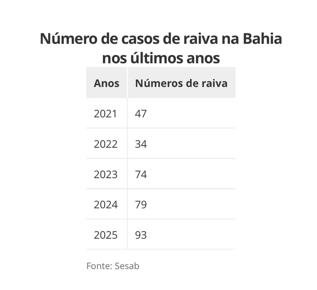 Entre os casos de novembro de 2025, está o do filhote de cachorro que morreu em Salvador. A cidade não tinha registros de raiva em cães e gatos há 20 anos. Confira os dados passados pela Sesab abaixo:
