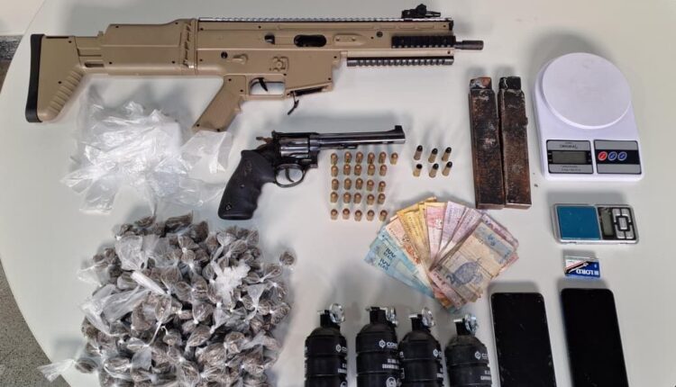As equipes receberam informações sobre a possibilidade de um confronto armado entre grupos criminosos rivais. Nas proximidades da praça central, os policiais avistaram um homem em atitude suspeita. Ao perceber a presença da guarnição, ele tentou fugir e entrou em uma residência, onde foi alcançado. No interior do imóvel, os policiais encontraram uma submetralhadora calibre 9mm, um revólver calibre .38, quatro granadas, dois carregadores, 26 munições calibre .40, cinco munições calibre .38 (sendo uma deflagrada), duas balanças de precisão e 185 buchas de maconha.