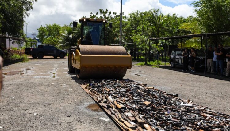 Com ordem judicial, hoje estão sendo destruídas na base da Coordenação de Operações e Recursos Especiais (Core), aproximadamente 1.200 armas, entre pistolas, revólveres, armas longas e artesanais. O material eliminado por uma máquina rolo compressor foi apreendido em Salvador, Mata de São João, no distrito de Monte Gordo, em Camaçari, além de Itamaraju e Teixeira de Freitas, no interior.