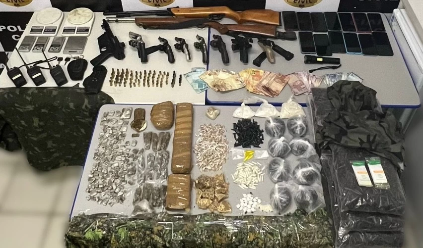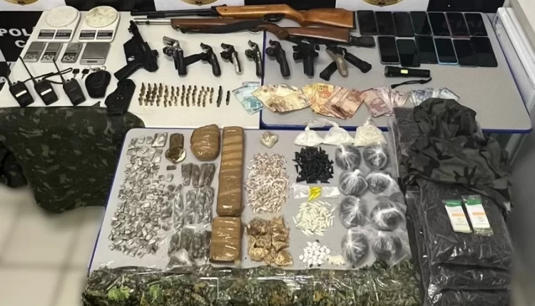 Com os suspeitos, foram apreendidos dois fuzis, duas pistolas, cinco revólveres, uma arma longa artesanal, além de carregadores, munições, drogas e cinco veículos.