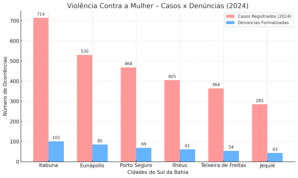 Gráfico comparativo entre os casos registrados e as denúncias formalizadas de violência contra a mulher em seis cidades do sul da Bahia, com destaque para Itabuna. Ele evidencia a grande disparidade entre os episódios de violência ocorridos e os que efetivamente chegam às autoridades.