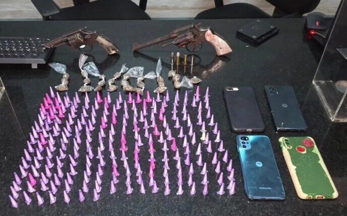 O material apreendido continha dois revólveres calibre .32 e .38, um simulacro de pistola, aparelhos celulares e porções de maconha e cocaína, localizados em uma área de mata após confronto armado entre os suspeitos e os policiais.