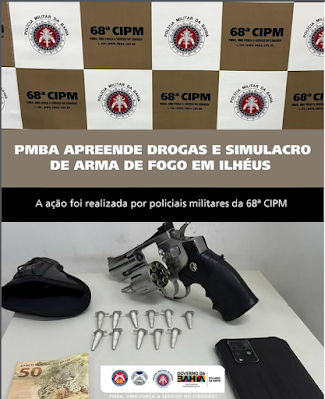A Polícia Militar da Bahia informa que, na noite deste domingo (26), durante a Operação Verão, guarnição da 68ª CIPM realizava rondas nas imediações da praia do Cristo, na Avenida Dois de Julho, em Ilhéus, quando identificou um indivíduo com volume aparente na região da cintura.Durante a abordagem e a verificação, foram encontrados 11 pinos contendo substância análoga à cocaína, um simulacro de arma de fogo, um aparelho celular, a quantia de R$ 50,00 em espécie, além de documentos pessoais.